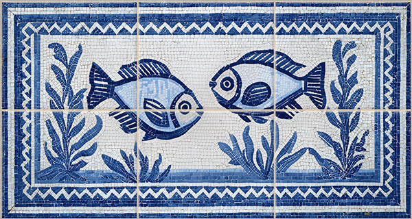 Tradicionális mediterrán mozaikmintás hangulatú kerámia csempekép. A kék és fehér színek kontrasztja, valamint a stilizált hal- és növénymotívumok időtálló, friss megjelenést biztosítanak.