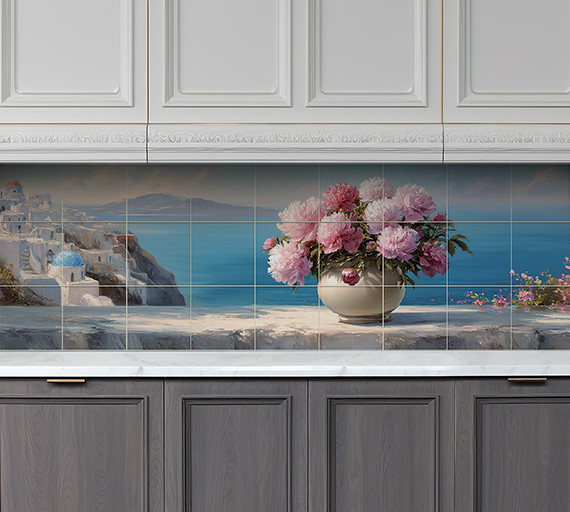 Ez az exkluzív csempekép a görögországi Santorini ikonikus, fehérre meszelt házait ábrázolja, kék kupolás templommal a háttérben, melyet egy napsütötte tengerparti terasz szegélyez. A kompozíció középpontjában egy nagy, fehér kerámia váza áll, benne frissen nyíló, rózsaszín pünkösdi rózsákkal, melyek szinte illatoznak a látványból. A háttérben elterülő, mélykék Égei-tenger és halvány rózsaszín égbolt romantikus, nyugalmat árasztó hangulatot teremt. A kép jobb oldalán dús, virágzó rózsaszín bokrok egészítik ki a tájat.