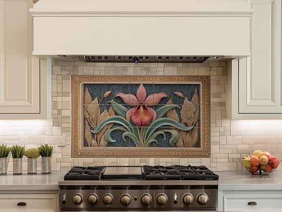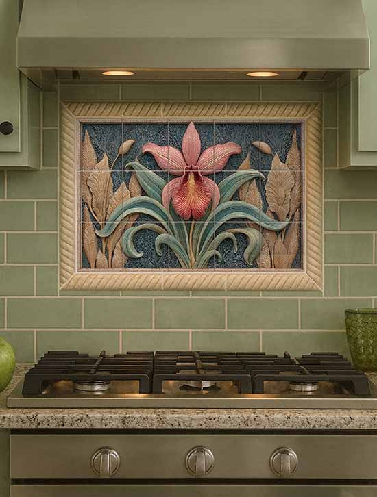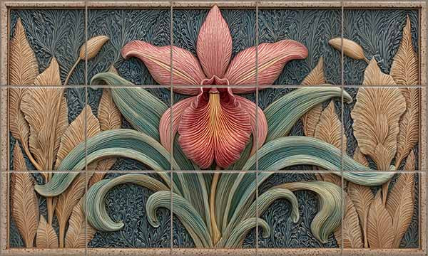Ez a művészi kivitelű dekorcsempe egy nagy, részletesen kidolgozott orchidea virágot ábrázol, amelyet szélesen ívelt levelek és finoman texturált háttér vesz körül. A kompozíció harmonikus színátmenetei és stilizált levelei elegáns és nyugodt atmoszférát hoznak létre. A csempekép klasszikus, természetes vagy akár egzotikus enteriőrökbe is jól illik, például nappaliba, étkezőbe, pihenőtérbe vagy wellness helyiségbe. Egyedi faldekor, amely fókuszpontként működik, és esztétikai értéket ad a térnek.