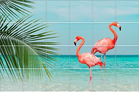 Fürdőszobai csempe flamingó, pálmafa és tenger mintával. Egzotikus fürdőszobai csempe mozaik.