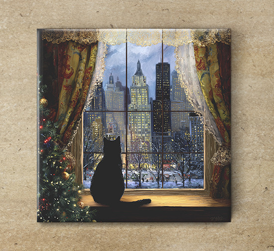 Edényalátét csempe, dekorcsempe téli városkép az ablakból fekete macskával mintával