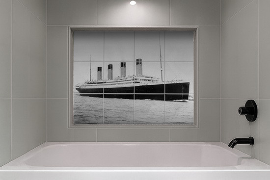 Ikonikus tengeri témájú dekorcsempe, a legendás Titanic óceánjáró megjelenítésével. Fekete-fehér hangulatú csempekép klasszikus enteriőrök és tematikus falak díszítésére. 1912 április 10-én a Southampton-i kikötőben Francis Godolphin Osbourne Stuart felvételén.