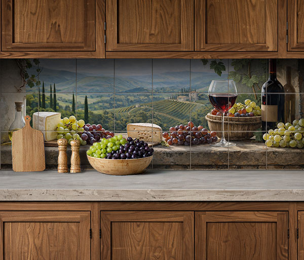 Ez a részletgazdag, toszkán hangulatú mozaikcsempe egy idilli borozós pillanatot örökít meg a vidéki Olaszországban. A kompozícióban többféle szőlőfürt (zöld, vörös, lila), egy karcsú borospohár vörösborral, egy üveg bor, sajt, egy üveg olívaolaj és egy rusztikus kőpárkány szerepel, amelyről lélegzetelállító kilátás nyílik a szőlőültetvényekkel tarkított dombokra, ciprusfákra és egy vidéki birtokra.