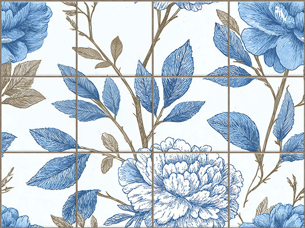 Visszafogottan dekoratív, rajzolt hatású csempe, amely klasszikus és vidéki enteriőrökbe egyaránt illeszthető. A kompozícióban stilizált, részletgazdag kék virágok, aprólékosan kidolgozott levélmotívumok és barna színű ágak láthatók, világos háttérrel.